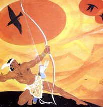 天上同时出现十个太阳。后羿为解决大旱问题,自己锻炼出一把威力无限的巨弓。后羿在弓上注入法力。然后携弓登上高山,以自己法力凝聚成无形之箭,引弓射日。